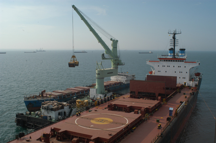 Liebherr offers specific offshore options including specially designed heavy duty hoisting winches, a strengthened boom, heel trim alarm systems and emergency operation functions. These options allow crane operation under heavy sea state conditions with wave heights up to 2.5 m and so facilitates the utility of the crane barge “Atlas-1” under conditions which may not otherwise be possible and so ensures efficient and uninterrupted transshipment of the goods.