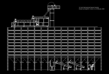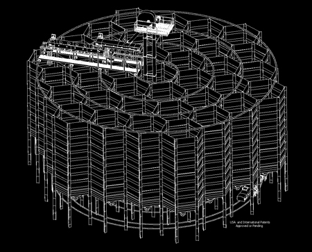 The hexagonal storage silos were just accepted by the European Patent Office, but still meandering its way through the USA Patent office ( USPTO ). The track-and-trolley guided conveyor system has been approved by the USPTO.