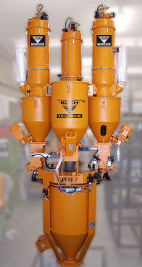 In the extrusion process, controlling the exact thickness of film or the meter weight of sections frequently presents a problem. This has prompted Koch-Technik to develop loss in weight GRAVIKO. How it works: The batch of materials is mixed or stored using a volumetric or a gravimetric mixing station. A slider fitted to the outlet empties a specific amount into the loss in weight gravimetric system below. This consists of a reserve container, the content of which is constantly weighed to determine the loss in weight per time unit. This allows the throughput of the extruder to be recorded or controlled via a control unit (e.g. a star feeder or by varying the speed of the extruder). When the weighing container of the loss in weight GRAVIKO is empty, the slider of the mixing station above it opens automatically and refills the reserve container. This new quantity is weighed and processed.