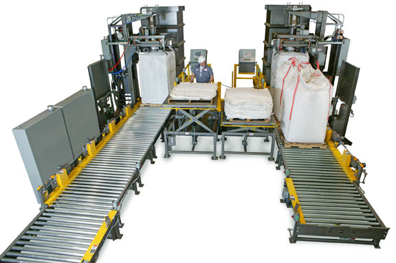 This totally automatic bag filling system by NBE National Bulk Equipment, Inc. allows one person to operate two (2) bag filler systems and is able to fill up to 40 bags per hour with this system. The material is introduced into the system using the customer's process or a bulk bag discharging station, at which time the material is packaged into bulk bags using the bag filling equipment.
