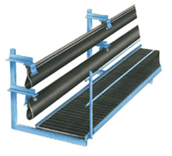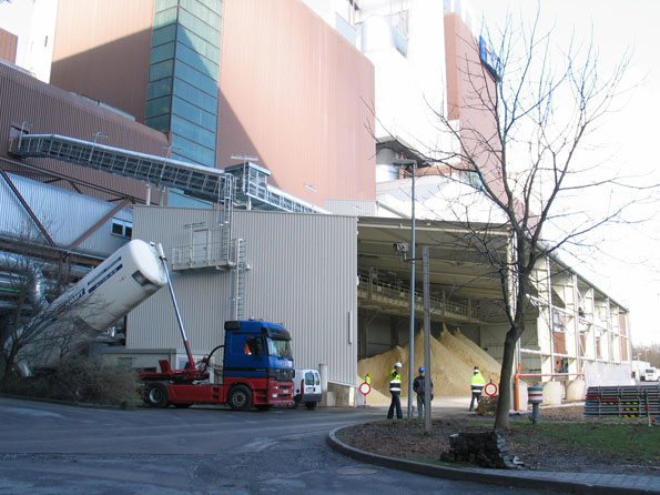 Auf dem Gelände des EnBW-Kraftwerkes fördert der SICON®-Taschenförderer – beschickt von drei Aufgabestationen – 10 bis 20 Tonnen REA-Gips pro Stunde. Dabei sind dem Gurt drei Entwässerungs-Bandfilter vorgeschaltet. Die Beschickungsstationen befinden sich innerhalb eines Gebäudes, aus dem der Fördergurt über zahlreiche Rohrleitungen und Treppenaufgänge hinaus auf das Betriebsgelände bis zur Abwurfstation führt. Im Gebäude ist es den Planern gelungen, die engen und teilweise unübersichtlichen Winkel und Ecken mit dem flexiblen Gurt zu meistern und die Anlage zügig in Betrieb zu nehmen. Das Fördersystem und die Außenanlage wurden von der Firma Anlagenbau und Fördertechnik Arthur Loibl GmbH installiert. In diesem Bereich verläuft der Taschenförderer in einer leichten, offenen Fachwerkbrücke mit einem einseitigen Laufsteg – zur Wartung und Inspektion der rotierenden Teile.