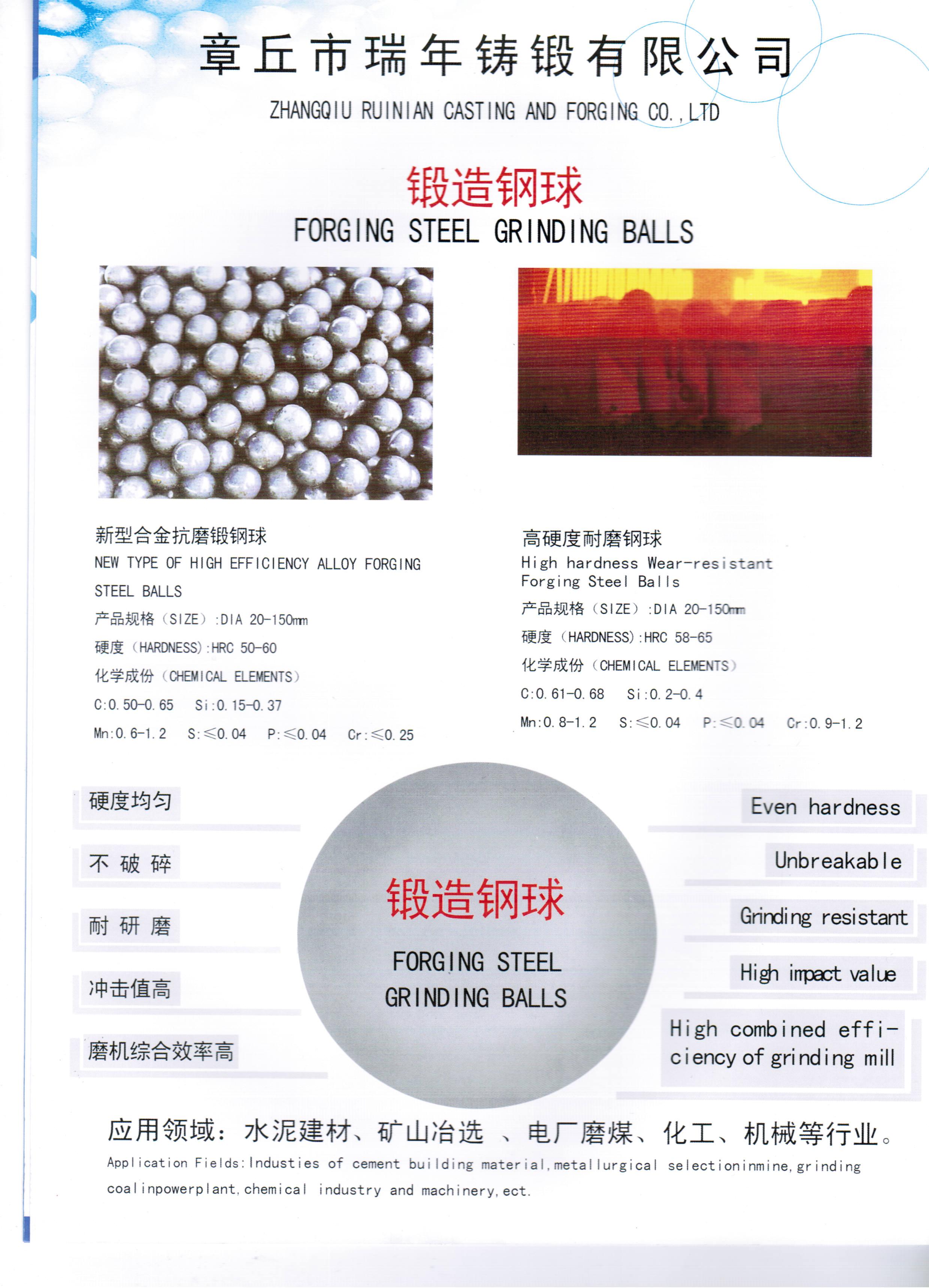 Zhangqiu Ruinian Casting and Forging Co. Ltd. are a professional company in producing forged steel balls, grinding steel balls, grinding media, grinding media balls, grinding balls in China. Grinding steel balls are mainly applied in mines, power station, cement plants and chemical fields.The steel balls made by us are of high hardness, even wearing,good wearing resistance, no breakage,which can really reduce the cost for customers.The sizes are available from DIA20-150MM,which are strictly manufactured as standard YB/T091-2005 grinding ball, which are exported to Japan, Korea, Australia and other countries and regions and obtained high reputation