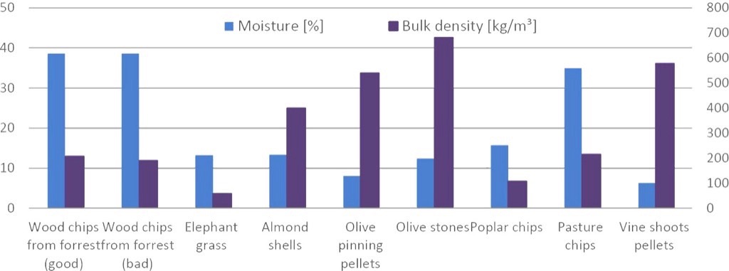 As mentioned before, several other biomass materials, such as straw, miscanthus and lawn grass, are also available on the market. However, the physical nature and mechanical behavior of these materials usually differ a lot; particles can be elastic, fibrous, flaky, and even stringy naturally.In recent years, many research projects around the world, such as BioBoost [22] or DIBANET [23], were initiated to address previous difficulties in harvesting, pretreatment, storage, transport and feeding of biomass, so as to optimise small- and large-scale applications. Besides, other ongoing EU projects, like FlexiFuel-CHX [24], aim at developing a new and highly efficient residential biomass heating technology regarding fuel flexibility; for example utilisation of forest residues, short rotation forestry (SRF- willow, poplar), miscanthus, olive stones, nut shells and agro-pellets. One important step of this project is to develop a fuel-flexible fuel feeding system, including fuel extraction system and feedstock.It is well known that the physical conditions of biomass depend on their type. Fig. 10 shows large and irregular differences between them with regard to moisture content and bulk density.