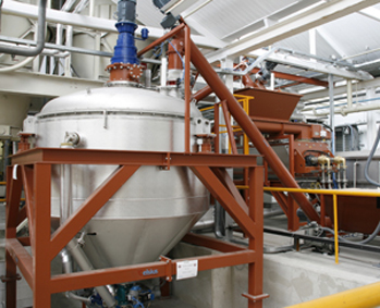Der Kalksteinmehlerhitzer wärmt das Material auf 140 Grad Celsius auf, während das Kunststoffgranulat in einem großen Heiztank geschmolzen wird. Der flüssige Kunststoff wird zu einem Kontinuierlich-Mischer gepumpt und das erhitzte Kalksteinmehl in den Mischer hinzugefügt. Die beiden Komponenten werden bei einer Temperatur von 140 Grad zu einer homogenen Masse vermischt. Anschließend wird die Masse mit einer geheizten Schnecke zur Teppichlinie befördert, wo die Beschichtung auf den Teppichfliesen angebracht wird. Die Kapazität der gesamten Linie, das heißt des Kreideerhitzers, Schmelztanks und der beheizten Förderschnecken beträgt 6 500 kg/Stunde. Die gesamte Anlage wird durch einen Wärmekreislauf mit thermischem Öl beheizt.