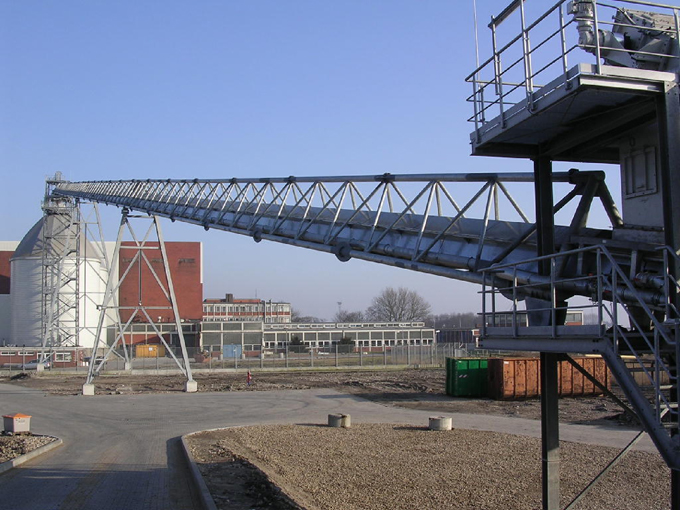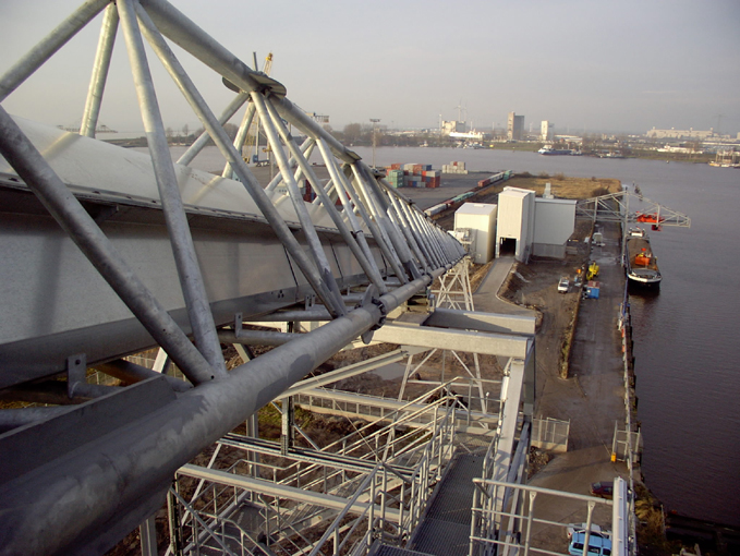 To accommodate space limitations at the Emden facility, the conveyor structure was engineered with an innovative triangular framework. Constructed of galvanized steel to withstand the coastal climate, the high-strength modular design was able to span the entire distance with just two intermediate supports. The conveyor is 40 inches (~1 meter) wide and travels up a constant 10° incline for a total elevation of 29.5 meters (97 feet) over its total span.