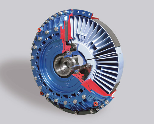 Thanks to its hydrodynamic operation, the coupling ensures particularly smooth start-ups. In nominal operation, the coupling transmits torque mechanically and slip-free – without any external influence. This is made possible by individual segments attached to the hub in a rotary fashion, which radially swivel to the outside after the start-up process. The mechanical synchronization between inner wheel and coupling shell sets in only once a certain speed has been reached, in most cases at 70 to 80 percent acceleration of the driven machine. Torque is therefore directly transmitted to the driven machine by a friction connection, ensuring smooth, hydrodynamically controlled start-ups with slip-free nominal operation. TurboSyn is the first hydrodynamic coupling with an integrated lock-up device that does not require extra installation space. The coupling provides higher drive economy; without coupling slip, energy savings of up to three percent are possible.
