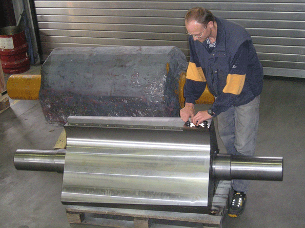 The low power input is due to the special rotor design: the rotor of the Herbold granulator has been manufactured from a single forged piece. For the rotor this does not only mean an enormous centrifugal mass but also a great stability due to the fact that there are no welding seams. The rotor knives of this rotor have been fixed against a back stop, thus preventing the rotor knives from moving even with extremely high cutting forces. This is absolutely necessary for this application since the tops and tails and the purgings can have wall thicknesses of up to 100 mm. (Fig. 2: Interior view of the A3 rotor),( Fig. 3: Blank and finished A rotor)
