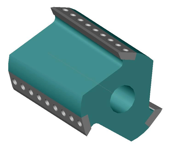 Herbold granulators work with a true double cross cutting action: Not only have the rotor knives been mounted at an inclined angle but also the stator knives have been mounted at an inclined opposed angle: this staggered configuration is the only one to ensure a constant cutting gap across the whole length of the knife and neatly cut material. The end product has extremely good flowing properties, few fines and a high bulk density. Without any difficulty it can be reintroduced in-line into the recycling process. (Fig. 4: Three-dimensional drawing )