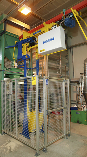 The travelling hoist units which are specially developed for transporting bulk materials in a minimum of space, and have a container volume of 50 l in the installation designed by KLANN, meet important requirements for high quality cores. The gentle motions ensure that the core sand is not separated, that the grains are not ground, that dust is not created and that the sand is not compacted. In addition, they provide minimum contact with the air, so the binding agent does not dry out or react, and that the finished sand mixture is supplied to the core shooter in good time. Since the mixture is transported in batches, uniform dwell times are ensured. This arrangement utilises the benefits of overhead handling by means of KBK lines, as worm, belt and drag chain conveyors as well as vibration chutes or pneumatic transport would be unsuitable for this application because they would have a negative effect on the core sand mixture.