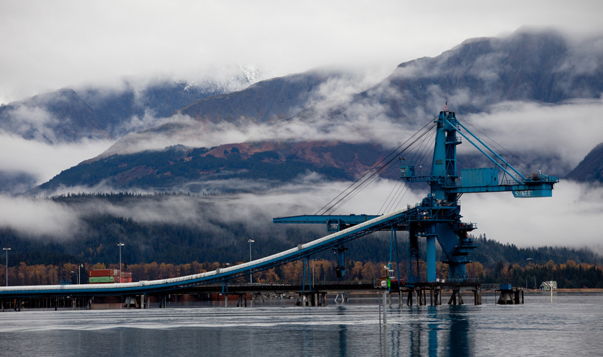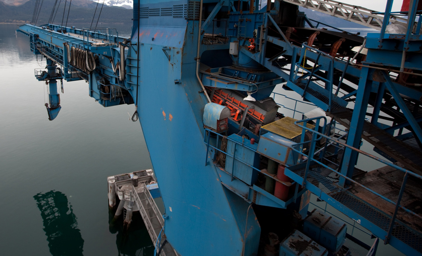 Fig. 1: Located on the Alaska's scenic Resurrection Bay, the ship loader at the Port of Seward loads coal for export.