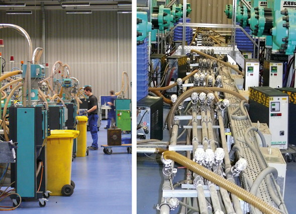 Thomas Schrenkhammer designed the conveyor system from the drying system to the injection moulding machines to meet the needs at the Tornesch production facility. Different lines for different materials transfer the dried granules to the production hall where each injection moulding machine can be connected individually to each line. This allows for a high degree of flexibility in deciding whether to operate all machines with centrally dried materials or locally, with the materials being dried using eco machine-side dryers.