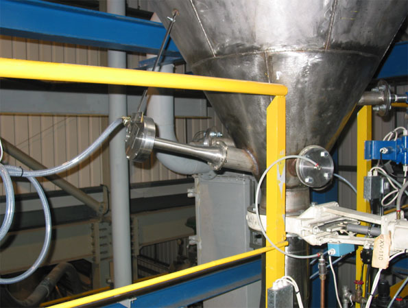 PRIMASONICS® supplied an Acoustic Cleaner Model PAS-420 complete with External Mounting Tube and other accessories. A small hole was cut on the side of the hopper discharge and the mounting tube welded in place. The PAS-420 Acoustic Cleaner was bolted to the flanged end of the mounting tube and the accessory items put in place. The Acoustic Cleaner was powered via a solenoid/timer by compressed nitrogen to avoid oxygen contaminating the product which activated the titanium diaphragm to create the correct sound frequency. The timer was set to sound the Acoustic Cleaner for a few seconds only at periodic intervals but only during either filling or discharging from the silo.