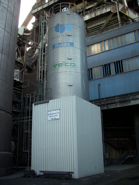 The company Hüttenwerke Krupp Mannesmann GmbH (HKM) in Duisburg-Huckingen/Germany use a VELCO injection installation at their blast furnace B. The installation consists of a storage silo with a volume of 90 m that is filled by silo trucks. The installation has been designed for the injection of fine grained solids as for instance Rutilit (a synthetic titanium dioxide carrier) Illmenit and carbon dust which are injected through the blast furnace tuyeres. The injection dispenser has two outlets that are connected each one with the a lance in 1 tuyere by a conveying line of 70 m. The injection capacity is approx.