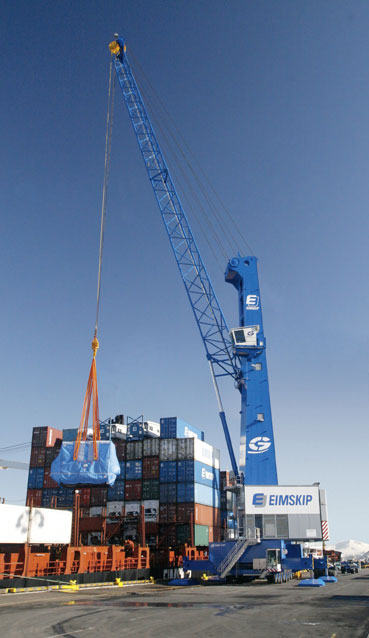 A Model 6 G HMK 6407 Mobile Harbour Crane in the Port of Reykjavik, Iceland, handling containers and project cargo. With eleven units sold in the first quarter of 2008, the new Generation 5 Model 6 further consolidated its position as Gottwald's new bestseller.