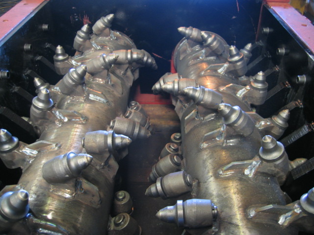 Both machines are fitted with tungsten carbide tipped point attack picks to break the coal, The picks are welded to the shafts in a scrolled helix type configuration to draw away the feed material from the feed end of the machine, each shaft is timed with the other shaft to provide a primary and secondary breaking action this action will provide a good cubical size product and present a manageable size to be transported via an overland conveyor to the secondary processing plant.