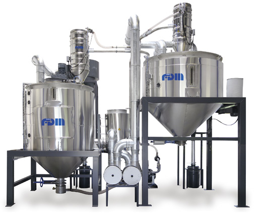 The PET crystallizers offered by FDM belong to the series of “little helpers”. The devices designed as solid bed crystallizers transfer PET material from the amorphous to the crystalline state, in a smooth and energy-saving way, thus facilitating the material handling as the agglomerating of the material during the drying process is prevented. The crystallizers can be used for granulates, bottle scrap and film regrind material. FDM has climbed into the league of worldwide leading suppliers on the PET recycling market. The company has carried out more than 20 crystallization projects with throughputs between 50 and 2.500 kg/h.