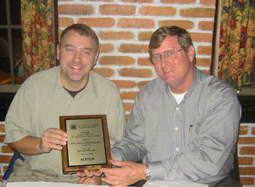 Stephen B. Denton (Vice President Raymond Operations) presents Patrick Smelko, Specialty Minerals, Adams MA with award plaque and certificate for $5,000 credit towards parts and/or service.