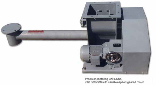 Precision metering units are employed for the uniform metering of small amounts of fine-grained or powdery bulk materials. An activation paddle above the feed metering screw ensures a uniform filling rate. Precision metering unit DN65, inlet 300x300 with variable-speed geared motor.