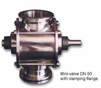 Dependent on their design, mini-valves are particularly suitable for metering powders and fine-grained materials with a maximum particle size of 2 mm. They are usually installed in pipelines or underneath small bins. Sizes DN 50 and DN 65 are supplied with clamping flanges. Sizes DN 80 / DN 100 are drilled to DIN specifications. The size 100 x 100 is supplied with a rectangular flange. Fitting position: The valves are designed for vertical material flow. Schäffer mini-valves have rounded chambers and because the rotor is precision-finished to the correct tolerances, afford maximum sealing integrity. Gap leakage caused by running clearance and wear, however, is possible. Special designs: Pressure-shock-proof to 10 bar or electropolished. Mini-valve DN 50 with clamping flange.