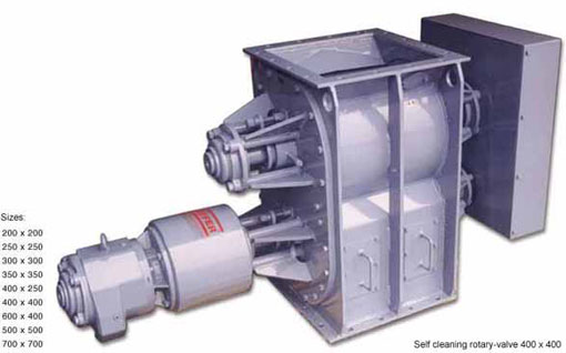 Self-cleaning rotary valves are rotary valves with special equipment to convey and meter powders and fine-grained materials that no longer flow freely. Each cellular chamber is emptied by means of a clearing blade.