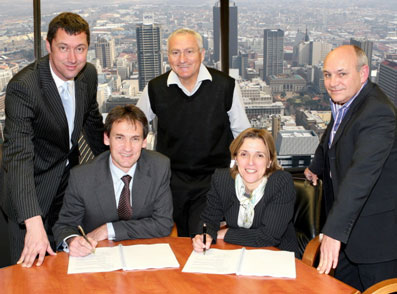 Signing an agreement to expand the Sishen-Saldana Iron Ore Export Channel, from left, Timo Smit, Head, Commercial, Kumba; Chris Griffith, Chief Executive Officer, Kumba; Louis van Niekerk, Chief Operating Officer, Transnet; Maria Ramos, Group Chief Executive, Transnet; and Leon Broom, General Manager, Iron Ore, Transnet.
