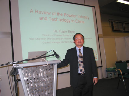 At a special session focusing on China, Dr. Fugen Zhang of the Chinese Society of Particuology (CSP) gave a presentation entitled "A Review of the Powder Industry and Technology in China". The presentation started with a summary of the work of the CSP which was formed to foster liaison and exchange amongst it's members whose work focuses on the science and technology of particles. Included in the presentation was a review of the major Chinese research institutes and universities involved in powder technology along with their main research themes. Dr. Zhang also reviewed the main market segments involved with powdered materials providing statistics on annual consumption and future trends. An important aspect of the presentation was the use of powder technology in the environmental protection and re-cycling industry which is of increasing importance in China. Finally, the presentation summarised statistics on the local suppliers of powder technology equipment in China.