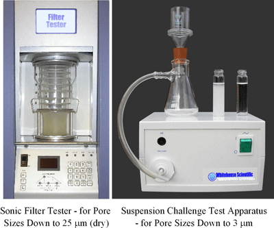 For pore sizes below 25 microns, a wet challenge test is recommended. In this case the particle size distribution of the microspheres passing through is measured.