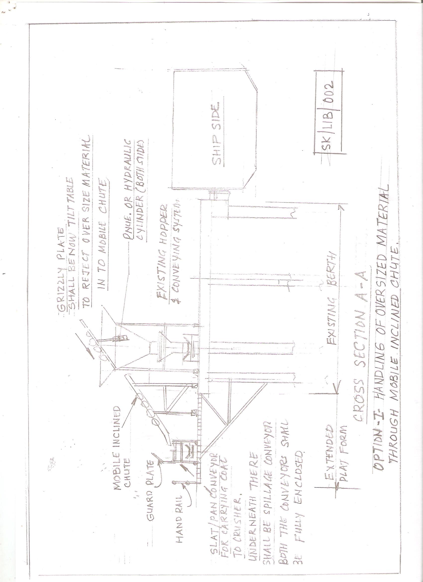 Option-2 In this option,we have added one new slat conveyor (with spillage conv. below this) at other side of berth(ref. sketch SK/LIB/002) with extended platform. The over sized material will be transferred from tilt table mobile chute to slat conveyor and then conveyed to crushing system.Since, the lump size is big up to 1500mmx200mm. Is it recommended to put inclined chute as shown in the sketch or we have other option about chute shape.