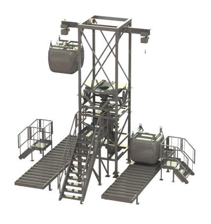 Modular bulk bag unload tower lets gravity do the processing. By combining a standard modular bulk bag unloader with an application specific frame, up to three steps of process can be achieved. Image shows an automated unloader with a rotary airlock feeding a Great Western scalper that discharges into a dust controlled airlock hopper for pneumatic transfer to process.