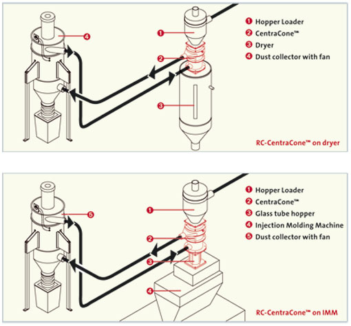 The RC-CentraCone™ DeDuster® is designed to fit on an injection molding machine or a dryer, shown on the 3D drawings above. The standard DeDuster® system includes a dust collector/fan combination. The system is also available as stand-alone compact unit on a mobile frame, including a cyclone, fan, inline filter, and electrical equipment. There are many other solutions available for various applications. The system is ideal for all types of granular products that need to be cleaned before processing, packaging, or shipping.