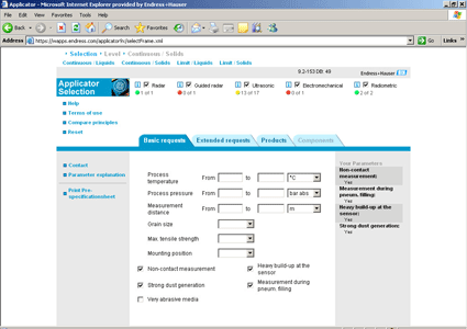 Available to all Internet users, the Applicator selection tool covers the areas of level, flow, density, pressure, analysis, temperature, recording and system components. Simply input the specific parameters of your measuring application and Applicator determines the appropriate measuring devices. The division of the input into ‘Basic Requests’ and ‘Extended Requests’ enables the Applicator selection tool to work at any stage of the engineering process, even without knowing all parameters of the applications! Traffic light colours are used as a straightforward means to display the results - recommended instruments are marked with green, restricted instruments are marked with amber and unsuitable instruments are marked with red.