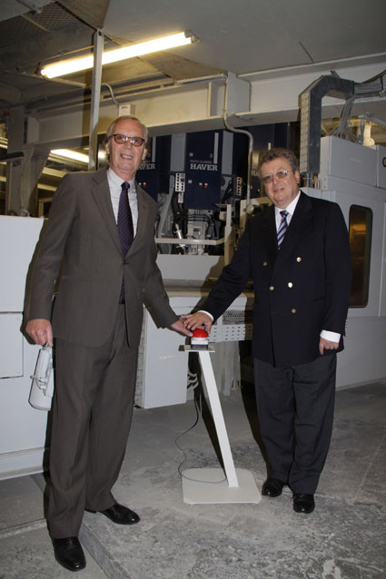 The Phoenix Zementwerken in Beckum, Germany shifts to the new generation of ROTO-PACKERS. Dr. Gustav Krogbeumer (managing director of Phoenix) and Dr. Reinhold Festge (managing director of Haver & Boecker) energise the HAVER ROTO CLASSIC® by symbolically pressing the start-button.