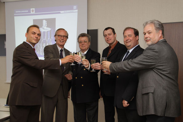 A toast to a successful project completion: It took only 10 days to replace the old packing machine with a new one. Shown above (l. to r.) are Kai Wagner (plant manager at Phoenix), Dr. Gustav Krogbeumker (managing director of Phoenix), Dr. Reinhold Festge (managing director of Haver & Boecker), Heiko Schlinkert (shipping director at Phoenix), Bernhard Pagenkemper (director of the Haver & Boecker business unit Cement) and Bernhard Stövesand (technical director of the Haver & Boecker Business Unit Cement).