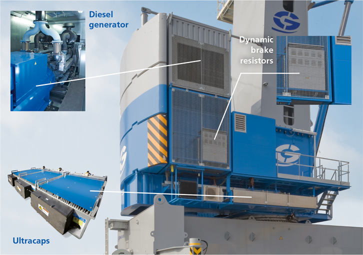 If the local quay infrastructure does not allow the Model 3 crane to be connected to an external power supply, the new, optional Gottwald hybrid drive is the key to improved efficiency, reductions in fuel consumption in a double-digit percentage range and lower exhaust gas emissions. A further benefit of the new hybrid drive is that the diesel engine has quieter running characteristics, which reduces noise emissions.
