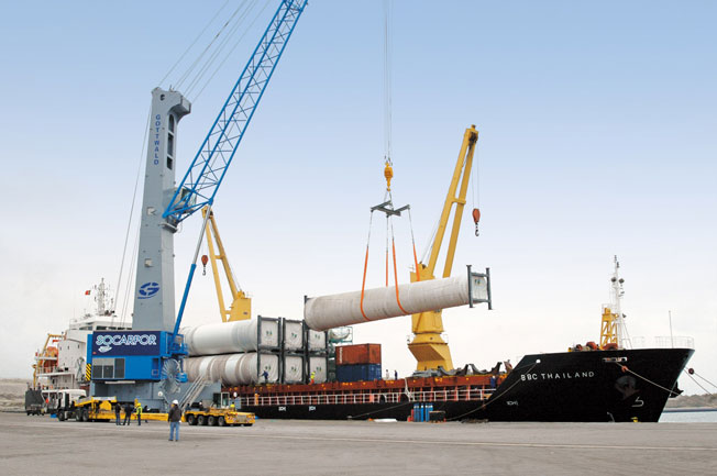 Model 7, G HMK 7408 B four-rope crane handling wind turbine components at Socarpor, Portugal. A similar machine will be in operation in the Port of Aalborg, Denmark, from November 2009.