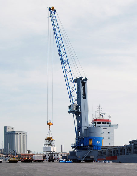 The G HMK 4406 crane has a maximum lifting capacity of 100 tonnes, a working radius of up to 46 metres and can serve ships up to the Panamax class. At the Scotto terminal in the Port of Livorno it is used as multipurpose crane for handling general cargo, containers and bulk materials, especially cellulose.