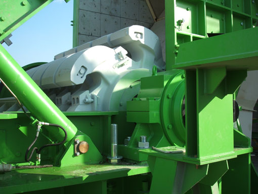 The plant essentially comprises a feed hopper, a rugged apron feeder and an impact crusher (Fig. 1). The feed material - limestone with an edge length of max. 1.5 m – is processed at a rate of 1,100 t/h. The limestone is a particularly abrasive material and puts great demands on the wear parts of the crusher. One specific measure taken to prolong the life of the blow bars of the HAZEMAG GSK rotor was to increase their mass, which naturally resulted also in a higher moment of inertia of the rotor.