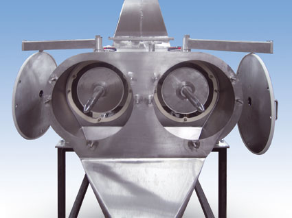 Fig. 1 + Fig. 2: Kason Centri-Sifter® Twin Centrifugal Screener delivers ultra-high capacity in a smaller footprint. Cantilevered, three-bearing shafts allow quick and easy removal of internal components for rapid sanitising.