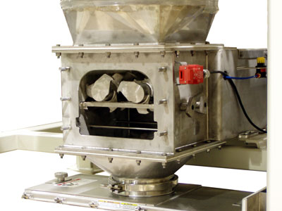 The lump breaker has dual 1” dia., counter-rotating shafts with eccentric rotor blades running between companion stators. The rotating shafts are designed for ease of cleaning as no tools are reuquired for assembly and ddisassembly. The maximum discharge particle size for this application was 3/8” . The unit is easily integrated into a NBE bulk bag discharger because its 20” dia. inlet is consistent with NBE's E3 outlet size.