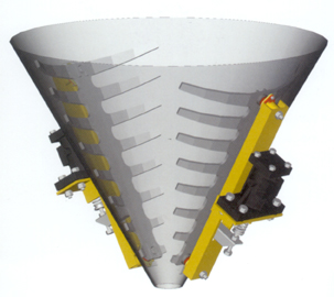 The Mucon Promoflow consists of a screen that is mounted on the inside of the hopper; parallel to the wall in the lower half of the discharge cone where flow problems generally occur. An external air piston vibrates or actuates the screen to ensure continuous material flow without bridging, segregation or ratholing. There are two screen types available to suit various materials – mesh screens for powders and granules up to 20 mm diameter and rib cage screens for large particles or fibrous material.