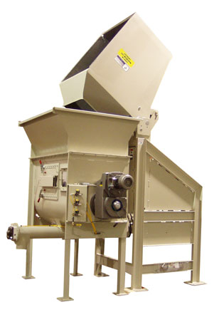 NBE provides comprehensive process system solutions to discharge and transfer non-free flowing materials without the effects of bridging and ratholing. A 150 degree container discharger dumps the material out of corrugated containers into an Agitator Hopper. The Agitator Hopper is designed to continually direct material into the horizontal delivery conveyor by maintaining an uninterrupted supply of material at the inlet to the screw conveyor. The screw conveyor transfers the material at a consistent and continuous rate to the inlet of the customer supplied Fox eductor.