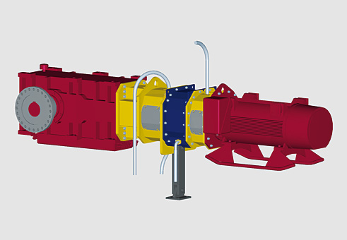 Voith type TPKL-T tunnel design fluid coupling: L-R: gearbox (red), tunnel housing (yellow), TPKL-T (blue), tunnel housing (yellow) and motor (red)