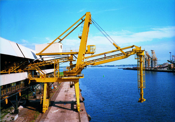Fig. 2: Travelling shiploader for fertilizer and urea, with a capacity of 1.200 t/h located in the Port of Rostock (Germany).