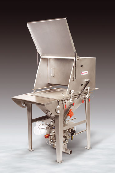 The all-stainless unit is also offered with an integral, flexible screw conveyor or with a universal hopper discharge flange for connection to downstream process equipment. It is also available mounted on frames with casters for in-plant mobility.