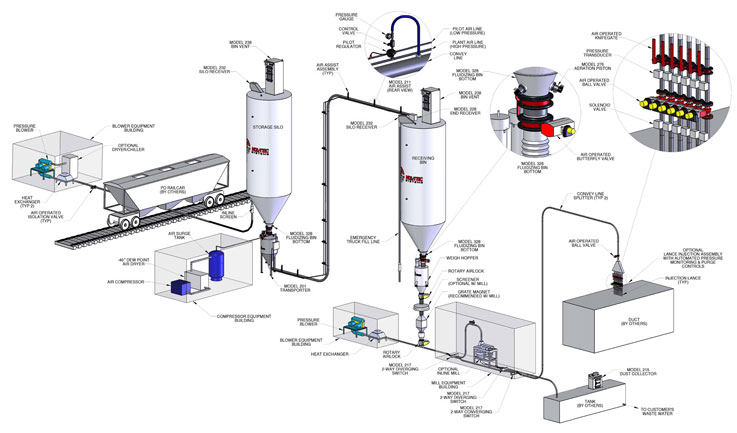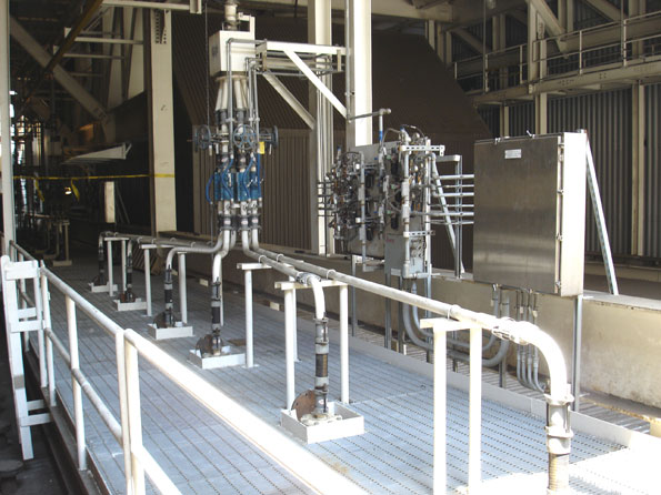 A fluidizing bin bottom is installed on each silo to prevent stored material from rat holing, bridging or arching. Each loss-in-weight feeder hopper is easy to calibrate and equipped with its own reverse jet pulse dust filter system, which traps the dust generated during feeder refill and returns it to the process. Each conveying line is equipped with a dedicated positive displacement blower connected to a common air dryer to ensure the sorbent material remains dry and does not plug the line. To facilitate maintenance, flow meters and variable frequency drive controls can be added to the blower packages. Conveying line insulation and blowout ports are also available. Injection lances are automatically purged of any blockages.