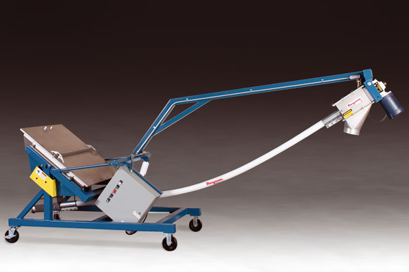 Photo: Bulk conveyor shown with hopper, support boom and conveyor assembly tilted down, allowing the unit to pass through narrow aisles, around corners and under obstructions. Horizontal orientation of conveyor tube's bottom end allows flexible screw to be removed easily for thorough cleaning and inspection.