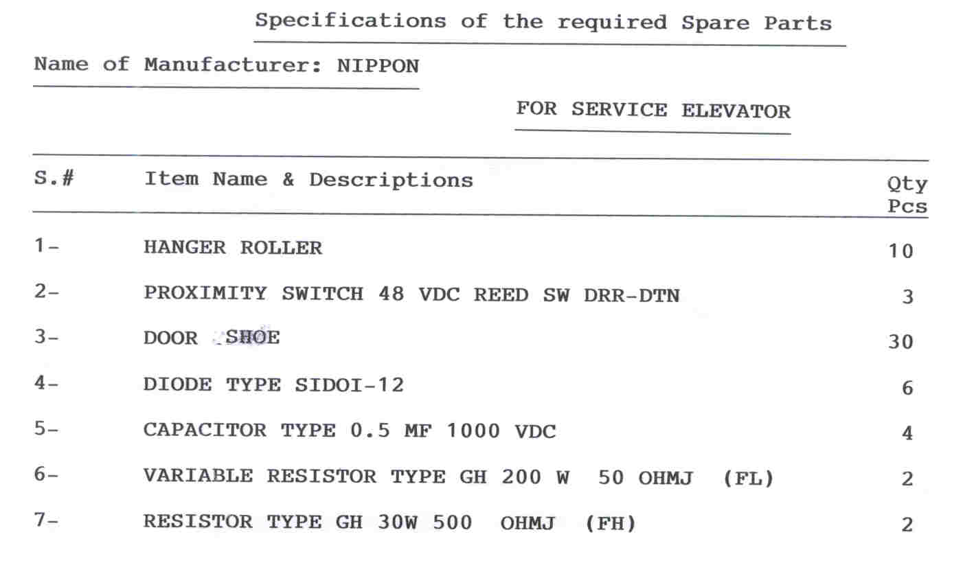 INQUIRY No.(ELEC/069/2001) spare parts for elevator