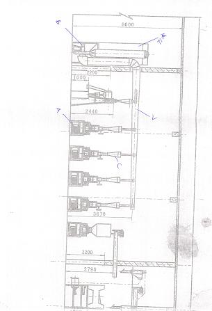 The plant has a variable diameter pipe of 3.8 metres long, the largest internal diameter being 0.38 metres and the smallest, 0.15 metres. It has 5 short tubes each with a diameter of about 0.1 metres protruding from its sides and conveying different intermediate (and final) products of the milling process at different rates. This variable diameter pipe is suspended and is being supplied air by one blower about 11 kW power.