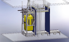 The difference between this and the conventional Big-Bag-filling station is that the filling Big-Bag includes the complete filling neck without transport palette that can be found in the so called hygiene area (white area). The goal is to eject the Big-Bags by transferring onto a palette with an outlet belt in a low specified hygiene area (black area). The transfer of the Big-Bags works with using a pneumatically driven traversing carriage and double roller gates between the white and black areas arranged to act as an area dividing system.