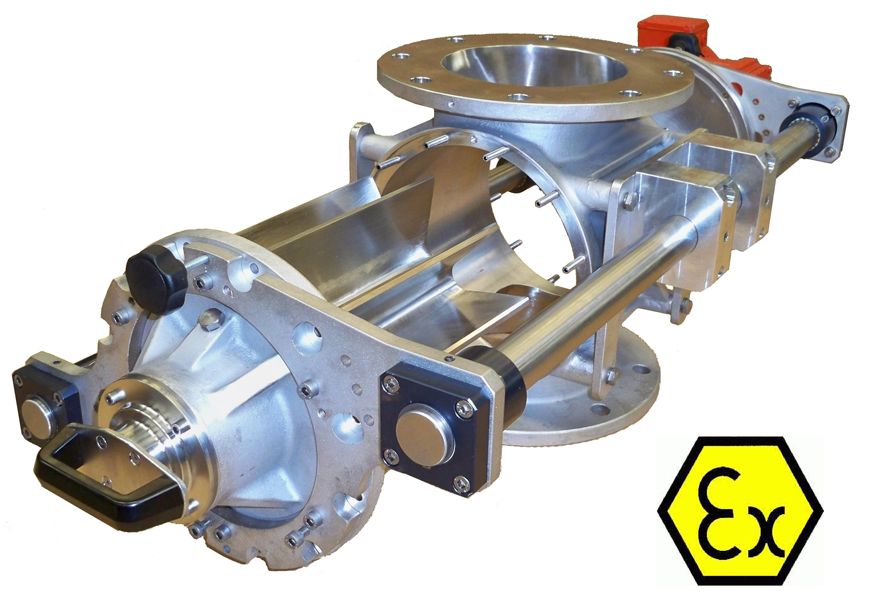 The solids Rotary valve Type SRVS is also suitable for the use under Ex-conditions. It has been tested by a well known and accredited testing center, the DEKRA – Exam. The prototype test has certified the suitability for zone 20. Therefore this rotary valve can be applied with declaration of conformity in zone 20 category 1 acc. ATEX RL 94/9/EC.